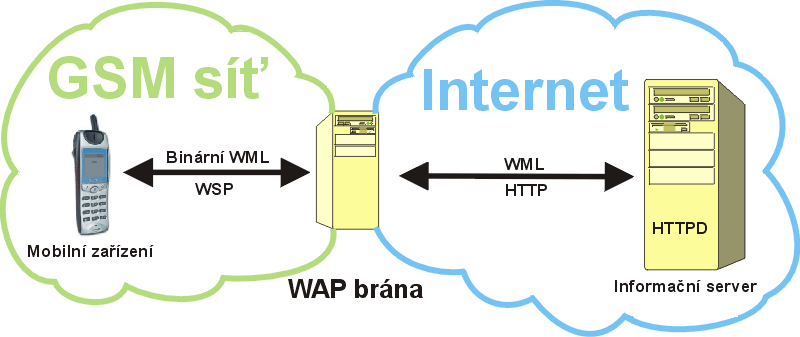 TCP/IP (Internet). WAP brána požadavek převezme upraví, a pomocí protokolu HTTP jej odešle k požadovanému WWW serveru. Z pohledu WWW serveru tedy WAP brána funguje