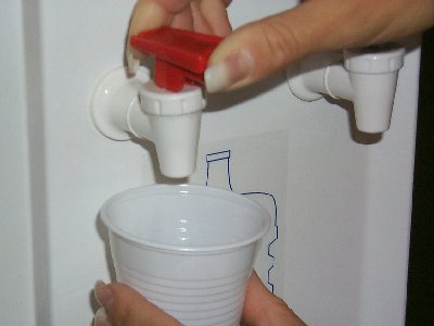 Naše asistentka Irena právě stojí u výdejního stojanu na teplou a studenou vodu. Studená voda teče po stlačení